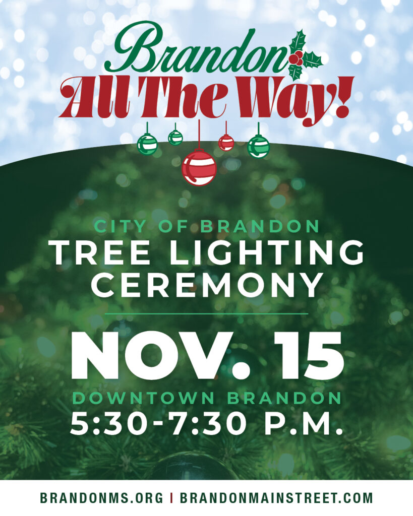 Brandon, Miss. (November 7, 2025) — The City of Brandon today announced it will launch the holiday season with its annual Tree Lighting Ceremony on Saturday, November 15, in downtown Brandon. The event will feature family-friendly activities, holiday music, and the lighting of the City’s Christmas tree all starting at 5 P.M.